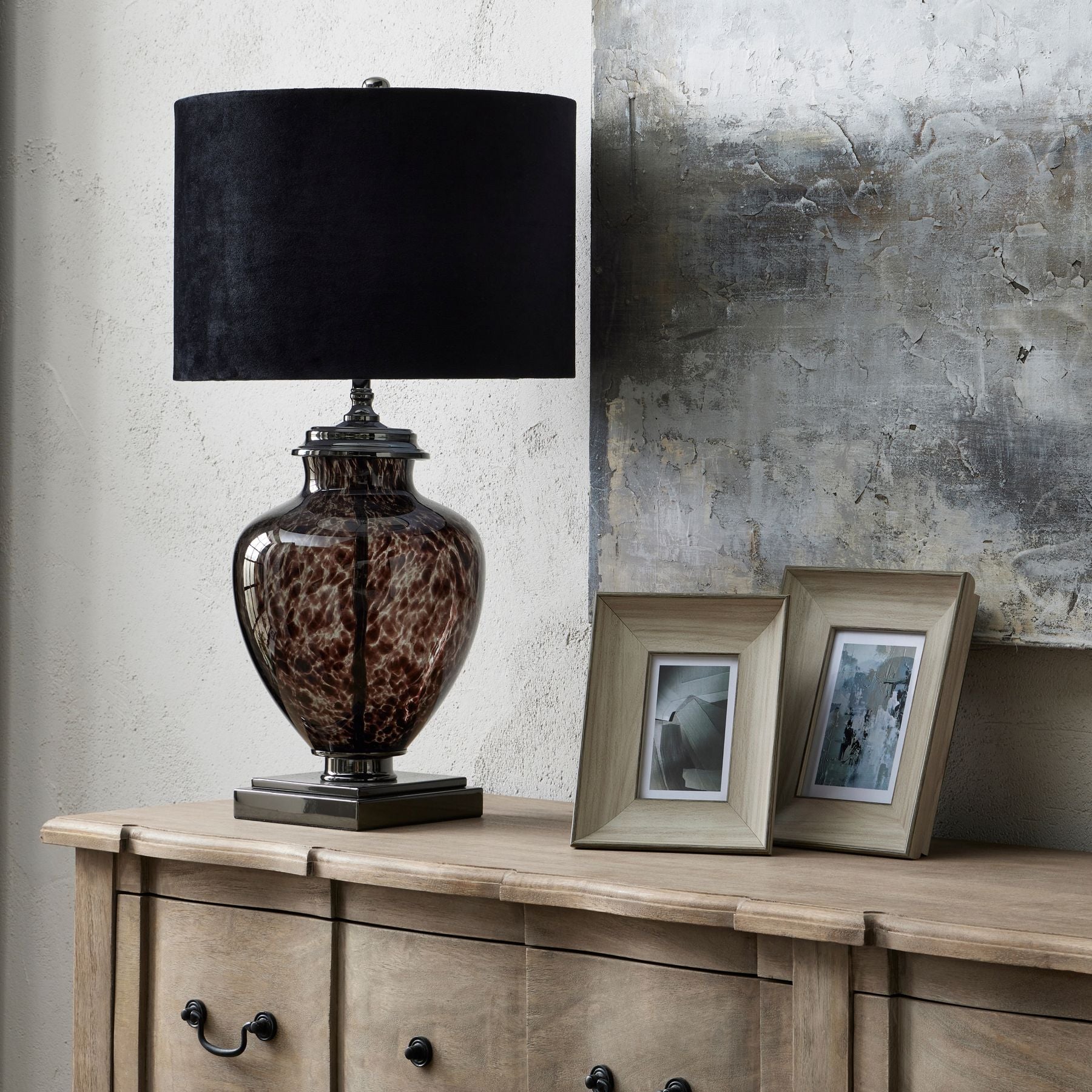 This is the Black Dapple Perugia Lamp. Dual colour glass table lamp (grey and black) beautifully hand painted with a unique and highly sought after ‘dappled’ effect pairs beautifully with a matching black velvet shade. Give your home a stylish and visually interesting update with this on-trend table lamp.