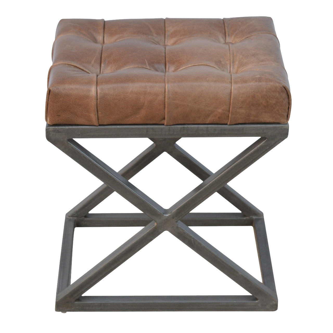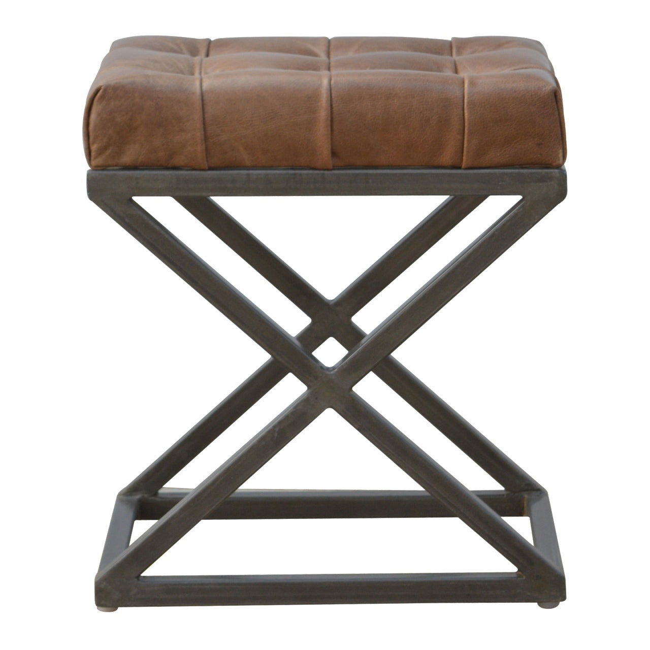 This seat pad has been constructed with an idustrial iron base and the seat is upholstered in 100% buffalo hide leather. Some other features include a criss-cross design on either side of the stool.